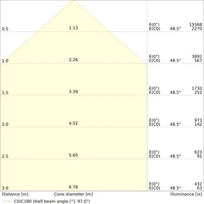 Der Abstrahlwinkel bezeichnet den Winkel, in dem das Licht aus der Lichtquelle ausgestrahlt wird. Er wird in Grad (D) angegeben. Je geringer die Gradzahl des Abstrahlwinkels ist, desto kleiner ist auch der Durchmesser des Lichtkegels, den die Lichtquelle produziert.
