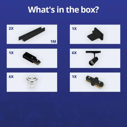 Description Ensemble complet Rail Monophasé Rail 2 Mètre Noir | incl. 6x Spot + GU10 2700K 3W Dimmable + Embout, Connecteur d’Alimentation et I-Connecteur