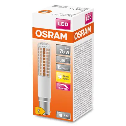 Cette ampoule Osram Special T Slim LED B15d Claire 9W 1055lm - 827 | Dimmable - Remplacement 75W avec son efficacité lumineuse de lumen par watt vous permettra de profiter d’un éclairage de qualité. Avec sa durée de vie de 15000 heures, vous n’aurez pas à vous soucier de son remplacement avant quelques années.